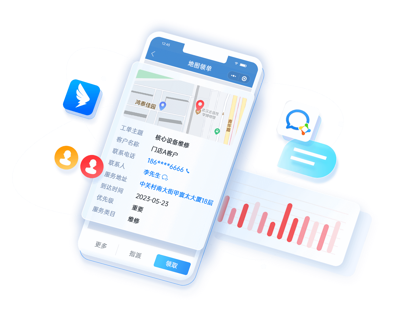 - 內外工單結合,客戶發起的報修工單自動派發到企業內部部門接單處理